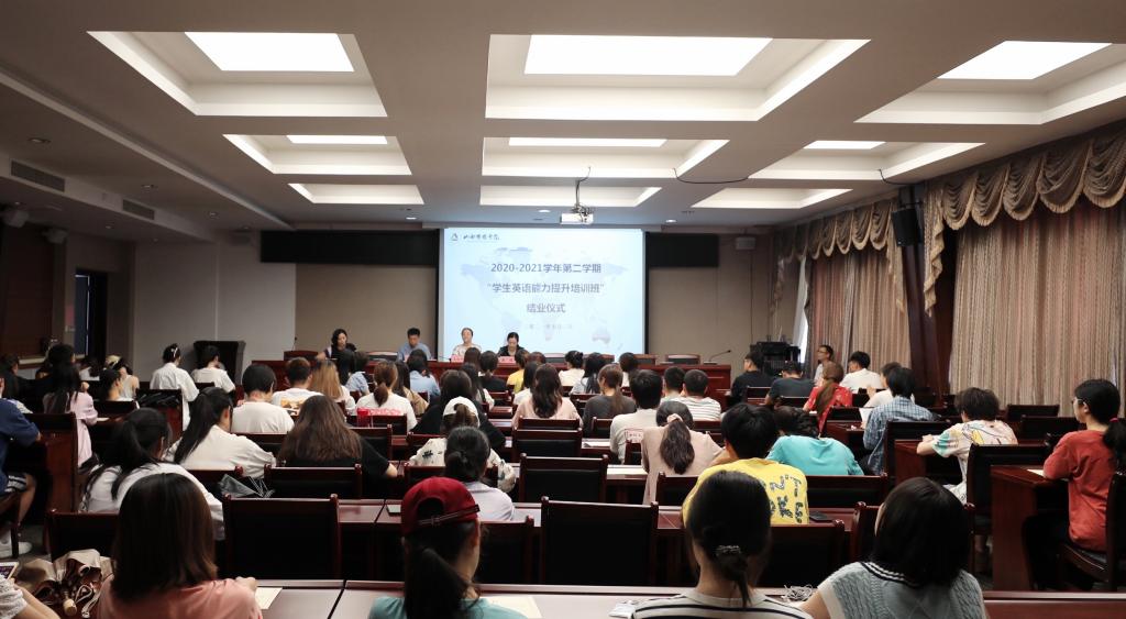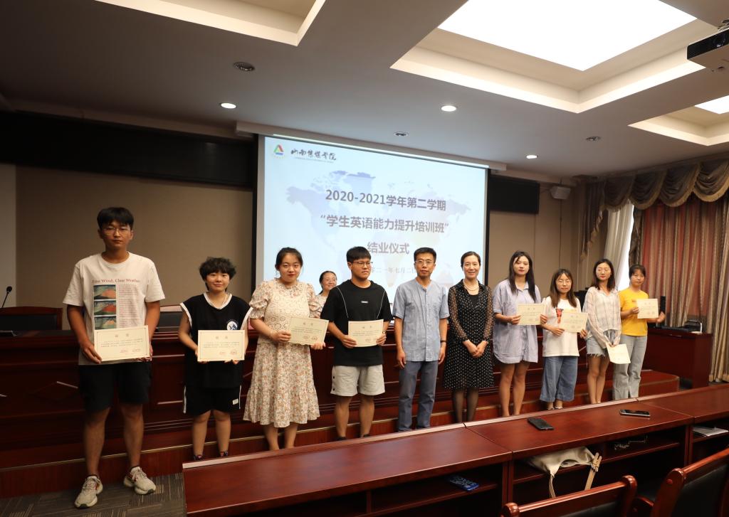 7月2日,我校在文华楼第一会议室举行2020-2021学年第二学期“学生英语能力提升培训班”结业仪式。副校长王红叶出席仪式并讲话。教务部、基础课教学部、国际交流合作部相关负责人及英语能力提升培训班全体结业学员参加了活动。