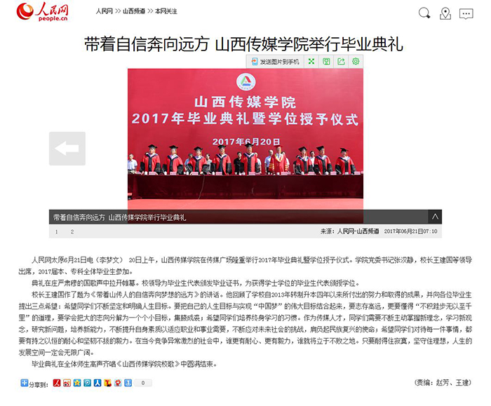 6月21日,人民网山西频道以《带着自信奔向远方 开云网页版举行毕业典礼》为题,对我校2017年毕业典礼暨学位授予仪式进行了宣传报道。2017届毕业生是我校升本后独立培养的第一届本科毕业生,这在我校的本科教育上具有重大的里程碑意义。 新闻链接:http://sx.people.com.cn/n2/2017/0621/c189132-30355997.html