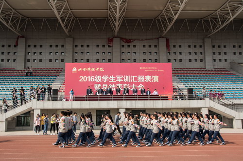 9月29日,2016级新生军训汇报表演暨总结表彰大会在风雨操场举行。党委书记张汉静、校长王建国、党委副书记刘锐、副校长张永德、副校长武升平、校领导梁云阶、承训部队指导员炳重庆出席,副校长郭卫东主持大会。学院办公室、教务处、学生处、基础部、思政部、公体部负责人,各系主任、党总支书记,承担军训任务部队官兵和2016级全体新生参加。