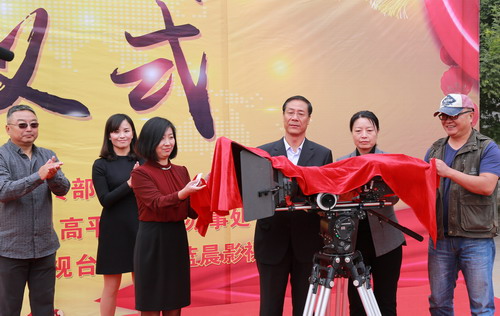 我校王建国校长、山西蓝晨影视文化有限公司赵华总经理、我校制作中心张伟主任和高平市李素仙副市长共同为电影开机揭幕。
